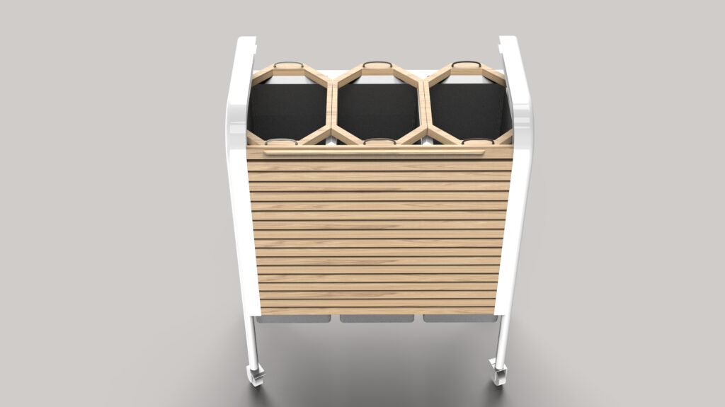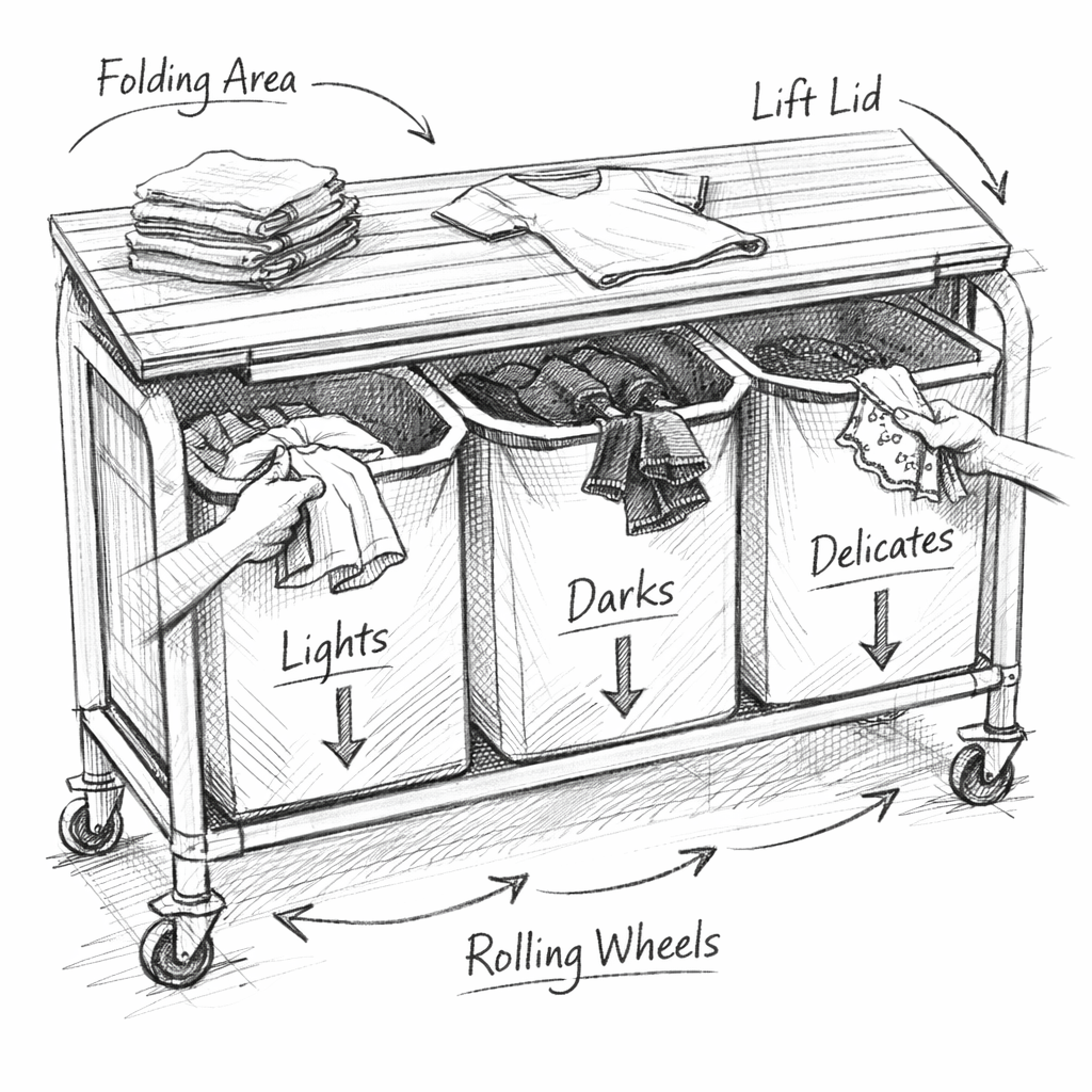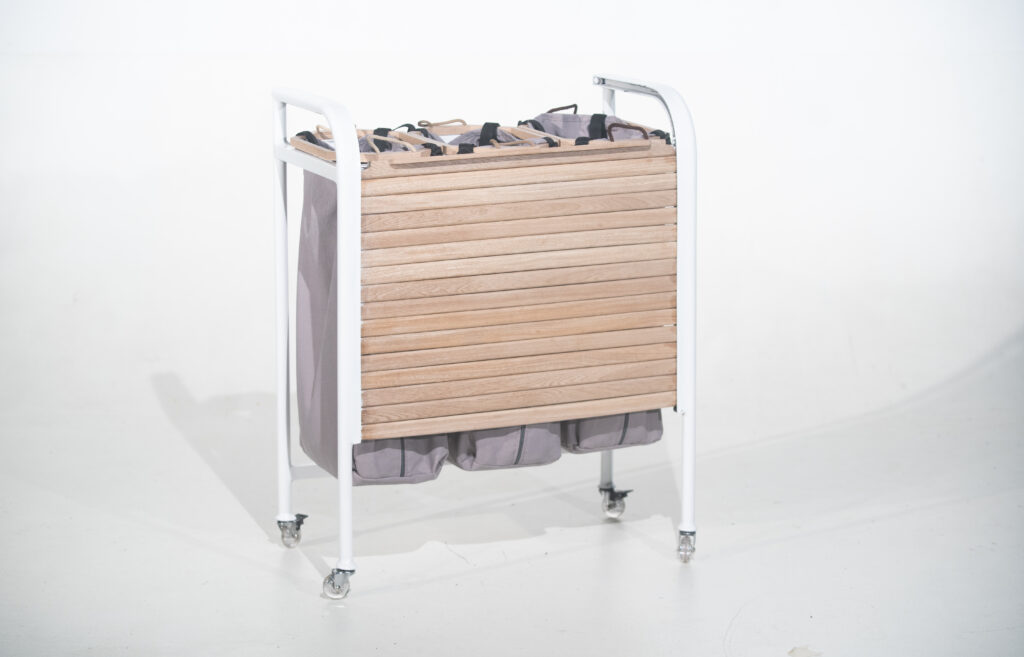 "Este sistema móvil de organización para lavandería representa una solución de diseño enfocada en la eficiencia operativa y la ergonomía del usuario. Su estructura se basa en un marco tubular minimalista que soporta tres compartimentos textiles independientes, permitiendo la clasificación inmediata de prendas en tres categorías distintas para agilizar el ciclo de lavado.