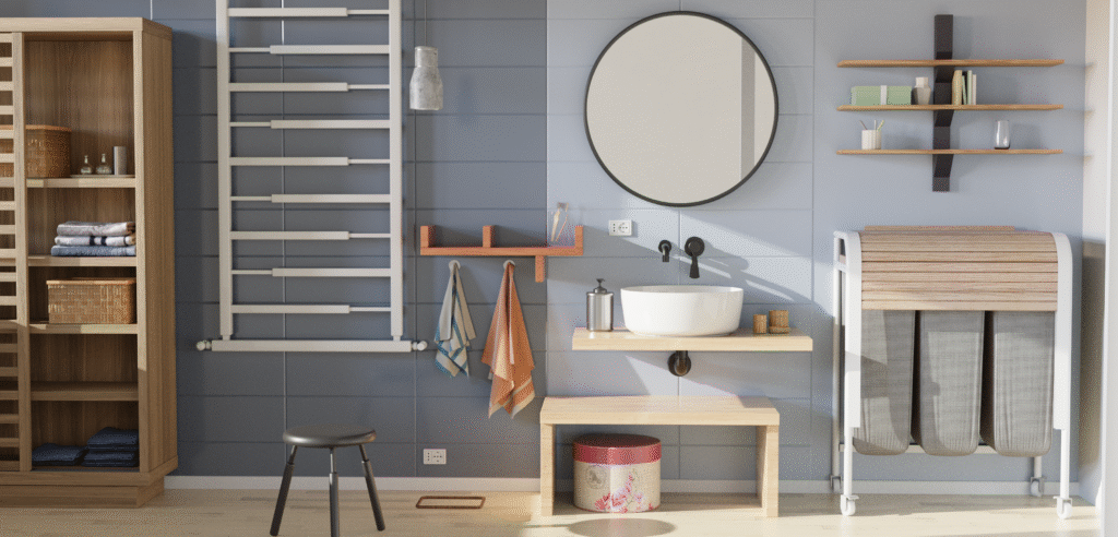 Un aspecto funcional clave es su cubierta superior de madera con diseño de listones (tipo persiana). Esta superficie no solo cumple una función estética al ocultar el contenido, sino que transforma el mueble en una estación de trabajo auxiliar ideal para el doblado o apoyo de prendas. Montado sobre ruedas giratorias para facilitar el desplazamiento sin esfuerzo físico, el producto fusiona la utilidad de un clasificador industrial con una estética cálida y contemporánea para el hogar."
